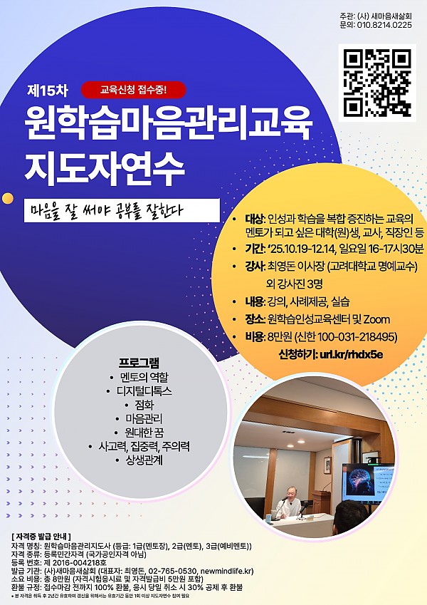 공지 | 제15차 원학습마음관리교육 지도자연수 신청안내 페이지 정보 작성자 관리자 작성일25-09-05 11:33 조회218회 댓글0건 목록 본문 제15차 원학습마음관리교육 지도자연수에 많은 관심과 신청 부탁드립니다. 신청하기 : url.kr/rhdx5e 댓글목록 등록된 댓글이 없습니다. 목록