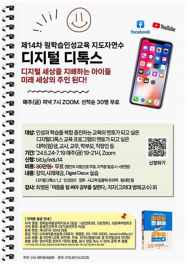 제14차 원학습인성교육 지도자연수가 디지털 디톡스 주제로 진행될 예정입니다. 많은 신청 바랍니다.
